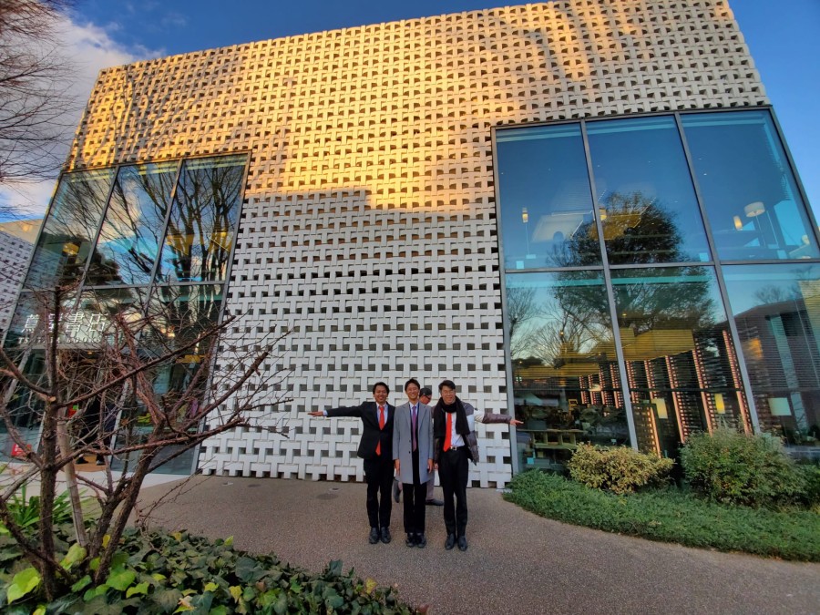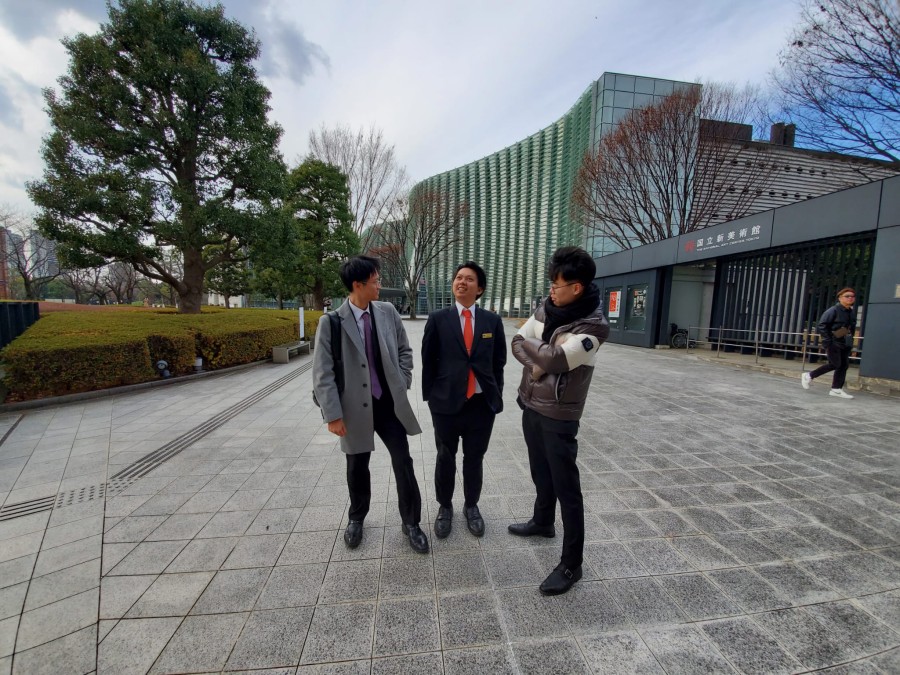 この研修では、プランナー達が東京の著名な建築作品を見て学ぶ機会を提供し、ガイド育成やガイドの質の向上に役立てます。建築研修は、都内にある世界的に有名な建築家が設計した建物を1つづつ実際に見て回り、建築家についてや、その建物の特徴などを学びます。研修は先輩プランナー茂木が講師としてプランナー達(3名)を案内しました。