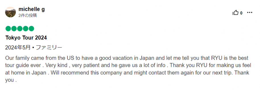 私たち家族は日本で楽しい休暇を過ごすためにアメリカから来ました。RYU は史上最高のツアーガイドだと言わせてください。とても親切で、とても辛抱強く、私たちにたくさんの情報をくれました。 RYUさん、私たちを日本でくつろいでくれてありがとう。この会社をお勧めしますので、次回の旅行の際にもう一度連絡するかもしれません。ありがとう 。
