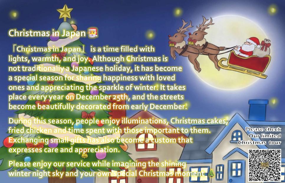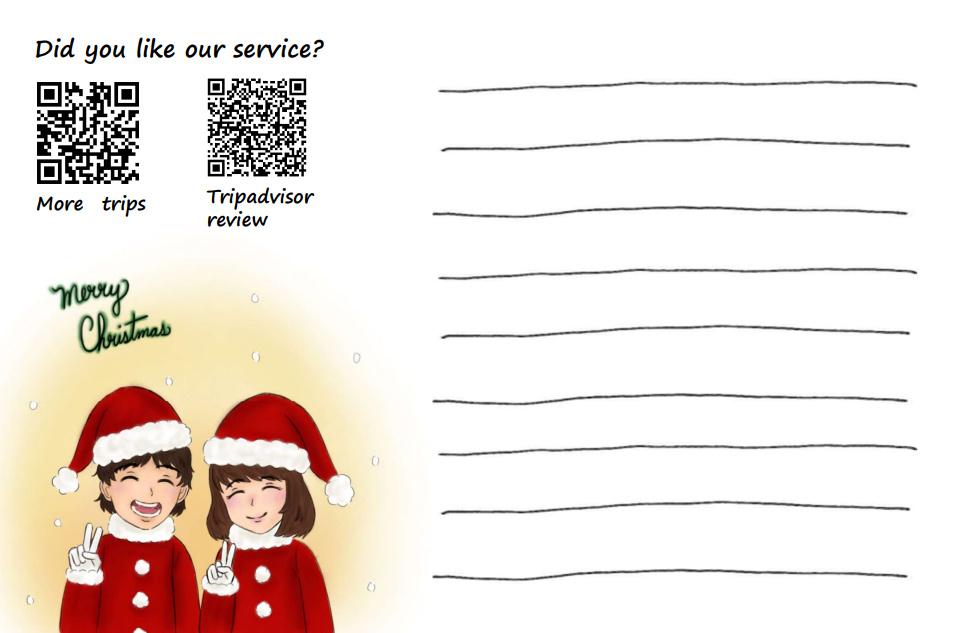 このポストカードには、表面: アウテックのホームページとTripAdvisorへのQRコード、裏面: 「日本のクリスマス文化に関する説明」と、人気の「イルミネーションツアー」へのQRコード。便利な情報も詰まっています!