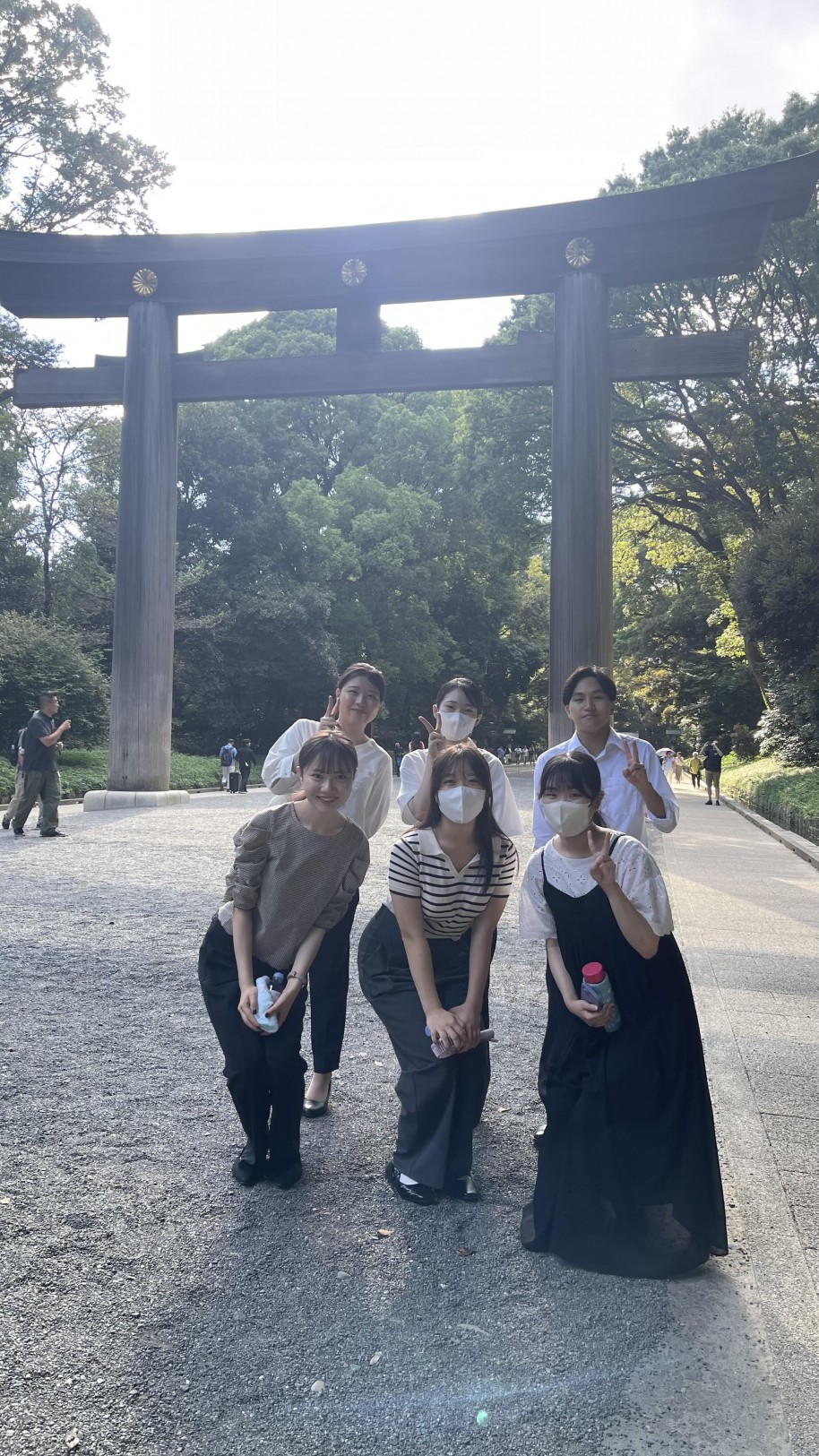 皆さんにご乗車いただき、車内では都内研修で学んだことなどを中心にご案内、そして明治神宮へ向かいました。明治神宮では、下車案内をしましたが、暑かったので本殿まで歩いてお参りをしたのちに車内に戻り次の目的地へと向かいました。
