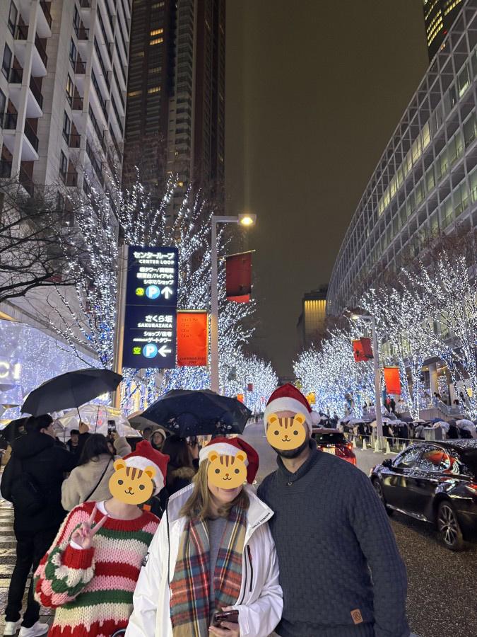 次に向かった丸の内仲通りでは、上品なシャンパンゴールドの輝きに包まれました。 旅慣れたご家族は、なんと世界30カ国以上を巡ってきたという生粋のトラベラー。先月はニュージーランド、かつてのW杯の際はオランダにいたという驚きのエピソードも。そんな世界を知り尽くした皆様も東京の夜景に感動されていました。行幸通りではクリスマスマーケットもやっており、そちらも立ち寄られて満足したご様子でお戻りになりました。