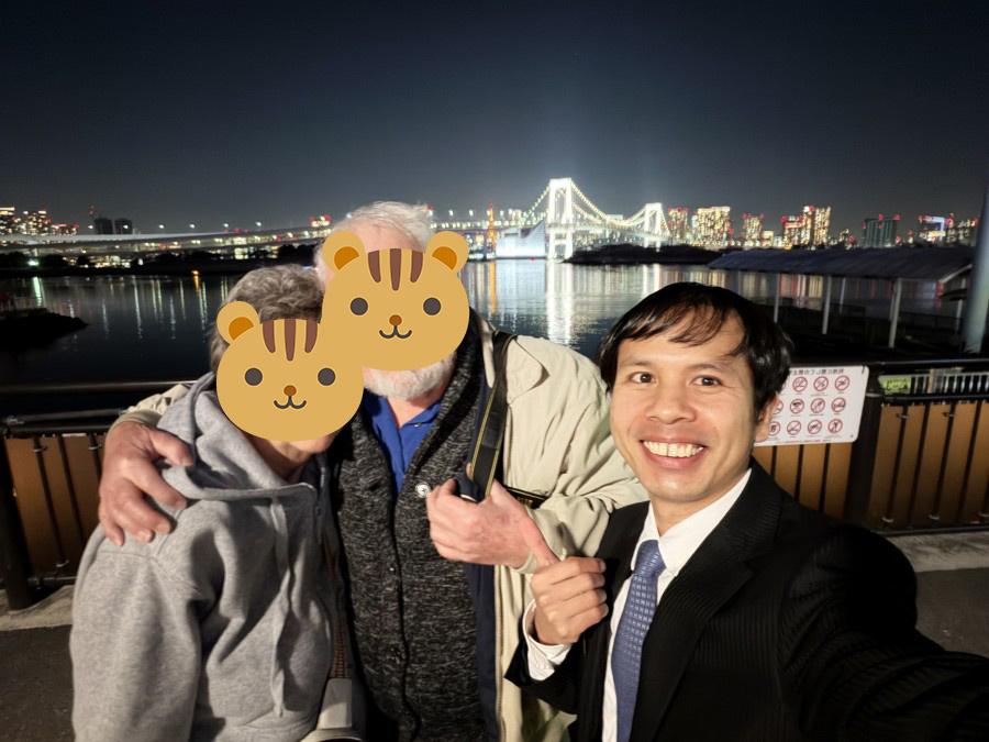 「空港までの時間は大丈夫かしら」と少し心配される奥様に、「大丈夫ですよ。時間はたっぷりありますから、安心してください」と笑顔でお伝えし、最後はお台場で東京湾の夜景を堪能。お二人のペースに寄り添った15分間の散策を楽しんでいただきました。