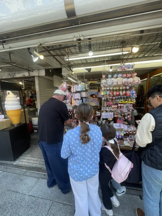 浅草寺での散策では、最初は少しシャイだった8歳の娘さんが、お声がけするうちに照れながらもお話ししてくれるようになり、ずっと私のそばを歩いてくださったのが本当にかわいらしく、印象的でした。仲見世通りでは、お父様がお子様たちのためにキーホルダーを20個も買われたり、いちご飴を頬張ったりと、日本らしい景色の中でのショッピングを楽しまれていました。